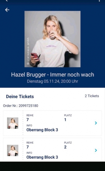 Ich verkaufe zwei Tickets für Hazel Brugger im Berliner Tempodrom am 05.11.24 Die Tickets befinden sich im Block 3 , Reihe 7 , Platz 1 und 2.