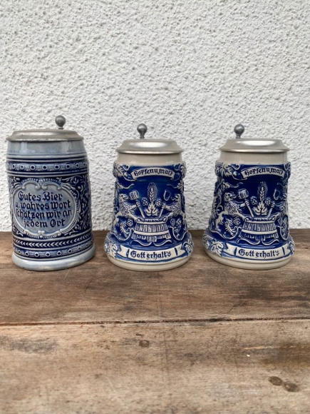 3 Bierkrüge von MR-Steingut mit Zinndeckel in sehr gutem Zustand