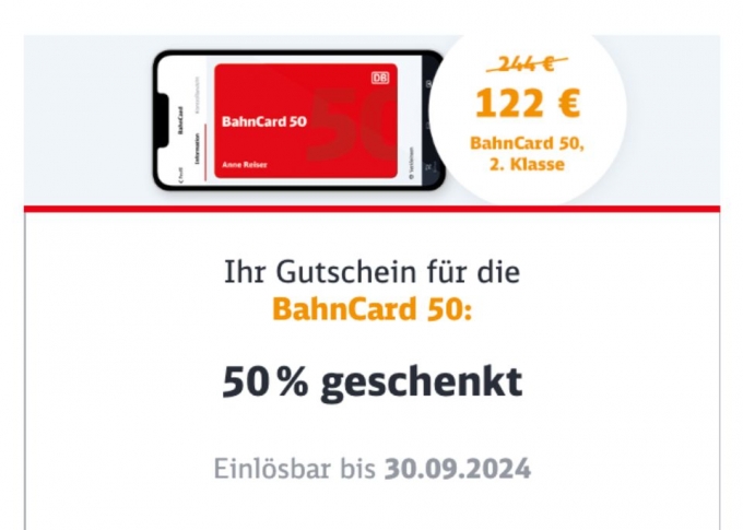 50% Gutschein für BahnCard 50 (2. Klasse)