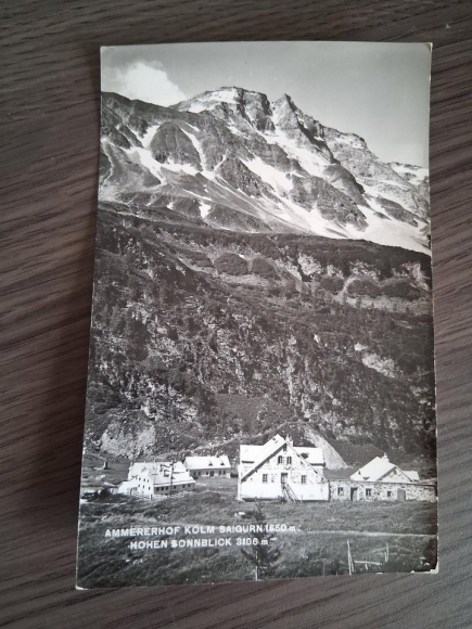 alte Postkarte, Ammererhof Kolm-Saigurn und Hohen Sonnblick, gelaufen am 6.7.59.