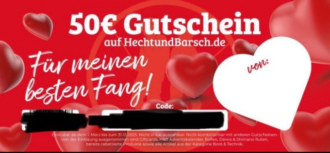 Ich hätte einen Gutschein für den (Angel) Onlineshop von Hecht und Barsch in Höhe von 50 Euro abzugeben.