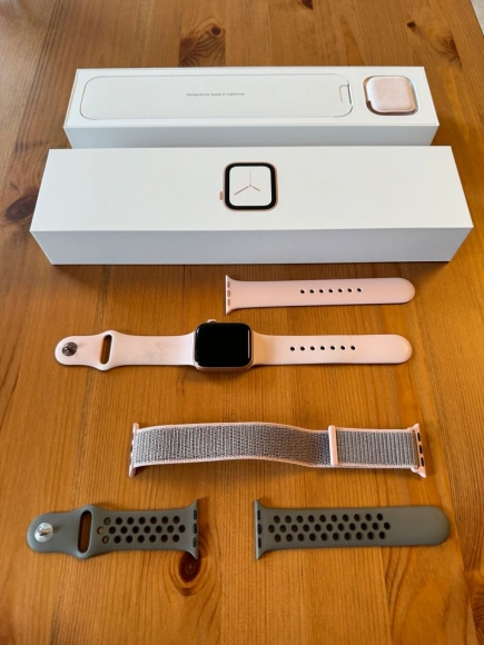 Inkl. 3 verschiedener Armbänder (Apple Silikon Sportarmband rosa, Stoffarmband grau/rosa, Original Nike Sportarmband dunkelgrün).