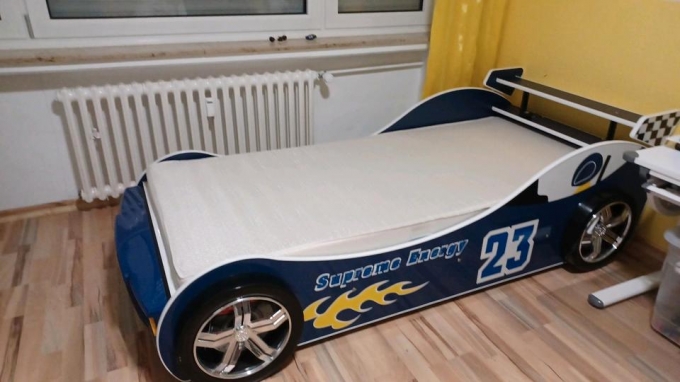 Angeboten wird im Auftrag ein Kinderbett als Rennauto in blau/schwarz mit entsprechenden Applikationen.