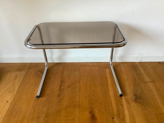 Designer Mid Century Glas Tisch Chrom Rauchglas Beistelltisch