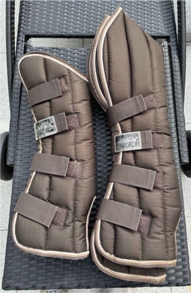 Zum Verkauf stehen hier gebrauchte Eskadron Transportgamaschen für vorne und hinten in der Farbe braun und Größe WB.