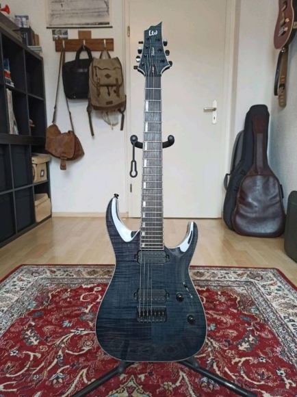 Verkaufe hier meine ESP LTD H-1007 7-String Gitarre im "See-Through-Black Finish" mit einer Flamed Maple (Riegelahorn) Top. Das Instrument hat ein wunderschönes, sehr dunkles Ebenholz (Ebony) Fretboard und 24 Extra-Jumbo Bünde. Der Zustand der Bünde ist perfekt. Sie sind weder oxidiert, noch abgenutzt, da die Gitarre relativ wenig gespielt wurde. Außerdem war die Gitarre nie außerhalb des Schlafzimmers, hat also keine Bühnen etc. gesehen.