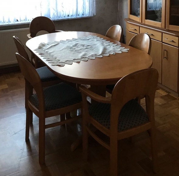 sehr gut erhaltener Tisch (Buche) um 1m ausziehbar, 6 Stühle, davon 2 mit Armlehne