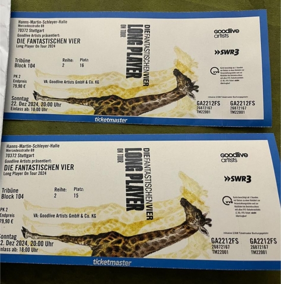 Ich biete hier 2 Karten für das Fanta 4 Konzert am 22.12.2024 um 20 Uhr in Stuttgart.