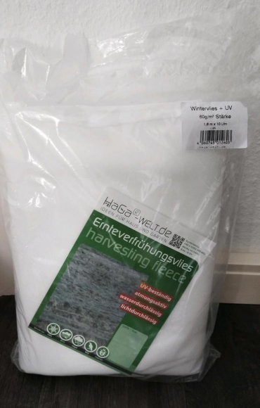 Ernteverfrühungsvlies 60 g./m² zur Abdeckung von Gemüsekulturen zur Ernteverfrühung. Frostschutzabdeckung - atmungsaktiv, UV-beständig, wasserdurchlässig, lichtdurchlässig. Maße: 1,6m x 10m