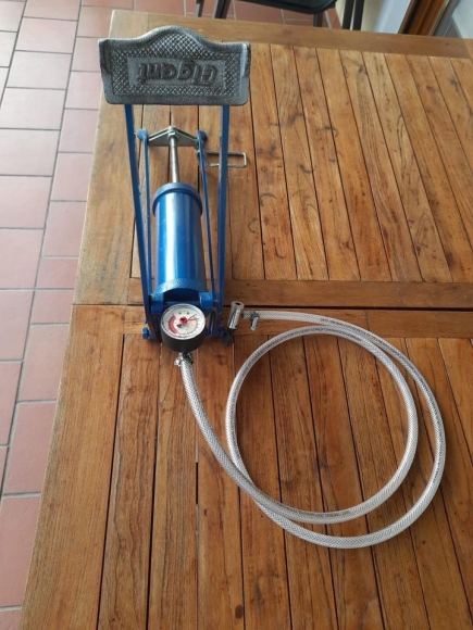 Gut erhaltene alte Gigant Luftpumpe in blau, erreicht noch maximal 2 Bar, könnte an einem verschlissenen Dichtring liegen. Ansonsten voll funktionsfähig. Über ein Fuß Pedal wird die Luft über einen großvolumigen Zylinder komprimiert. Gebaut in massiver Ausführung. Der Schlauch wurde erneuert. Versand möglich per Hermes für 6,99€.
