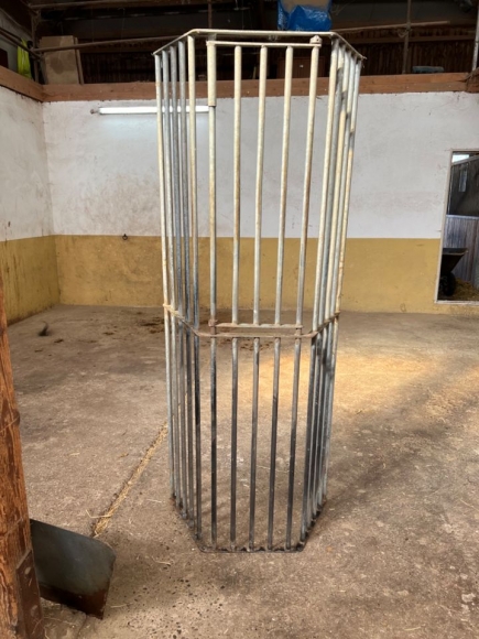 Diese feuerverzinkte Heuraufe kann als Wand- oder Eckraufe verwendet werden. Im Bodenbereich befindet sich eine schräggestellte Bodenplatte, so dass Heureste gut nachrutschen können. Die Heuraufe lässt sich sehr leicht von vorn befüllen, ihr lichter Gitterabstand beträgt ca. 6 cm. Sie ist ca. 80 cm breit, 200 cm hoch und 40 cm tief.