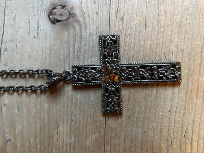 Halskette mit Kreuuzanhänger - Modeschmuck - silberfarben mit Steinen