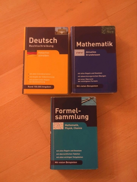 Verschenkt werden drei handliche Nachschlagewerke für den Bereich Deutsch, Mathematik, Physik und Chemie. Ideal für das schnelle Nachschlagen in Schule,Studium und Beruf, zum schnellen Verständnis des Mathe-Grundwissens und zum schnellen Nachschlagen sämtlicher Formeln von Mathe, Physik und Chemie.