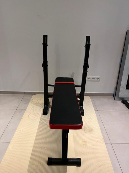 Es wird hier eine Hantelbank in rot/schwarz angeboten.