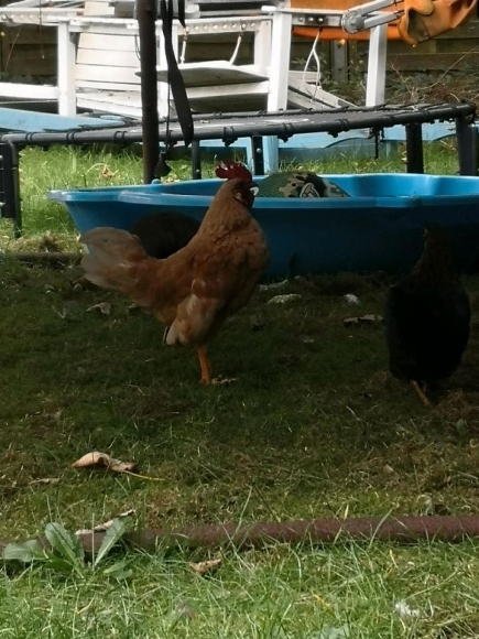 Hier stehen zwei Hennen und ein Hahn zu verkaufen.