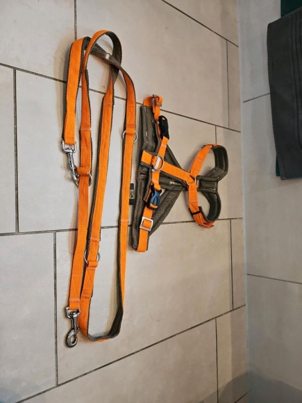 Gepolstertes Hundegeschirr mit geteilten Bruststeg und zusätzlichen Brustring. Keine Risse oder Löcher