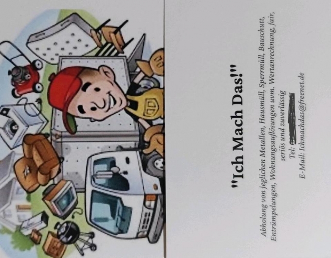 Hallo zusammen, wir von IchMachDas haben es uns zu Aufgabe gemacht, alles für unsere Kunden zu machen. Damit unsere Kunden keinen Finger krumm machen müssen gibt es uns. Von Wohnungsauflösungen, Entrümpelungen jeglicher Art, Maler arbeiten, Entsorgung von Müll/ Schrott oder sonstiges sind wir Ihr Ansprechpartner. Bei Interesse gerne erste Kontaktaufnahme über eBayKleinanzeigen oder per E-Mail.
