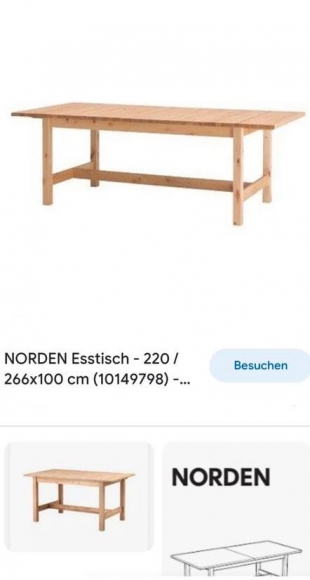 Zum Verlauf steht der große Norden-Esstisch von Ikea, der schon seit einigen Jahren nicht mehr erhältlich ist, helles Birken-Holz, 220cm unausgezogen, mit dem Einsatz 266cm lang und 100cm breit und sehr stabil.