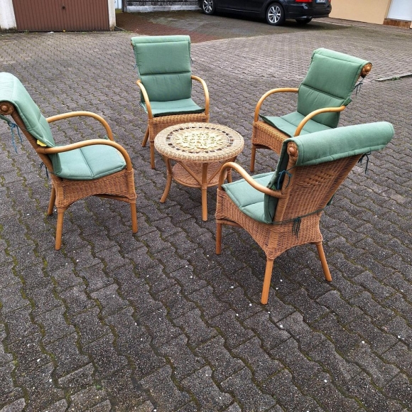 Jutlandia Rattan Stühle mit Tisch und Auflagen