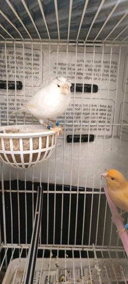 Pärchen Kanarienvögel von 2023,der Hahn in Farbe Orange und die henne in weiße Farbe mit schwarze Haube