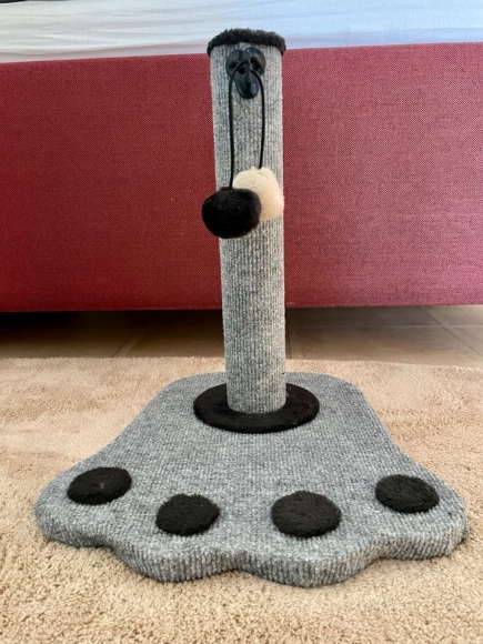 Biete einen nagelneuen unbenutzten kratzbaum an, mit Plüsch Bällen, in der Farbe grau..