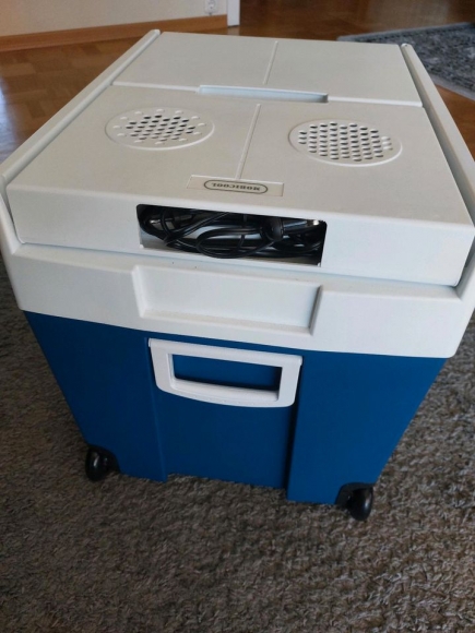 Biete elektrische Kühlbox mit Rollen passend für eine komplette Getränkekiste/Bierkiste, 48 Liter, 12V und 230V für Auto, Reisemobil und Steckdose. Benutzt für einen Urlaub