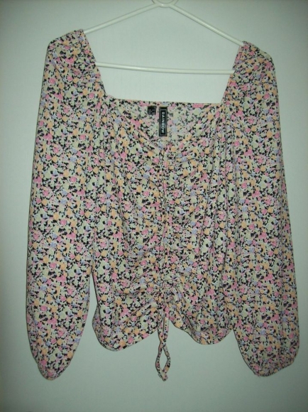 langärmelige Shirtbluse schwarz-bunt von Rainbow (Bonprix) mit Gummibündchen an den Ärmeln und den Schultern, Tunnelzugband vorne zum Regulieren der Ausschnitttiefe, Gr. 44/46 (XXL), Länge ca 57 cm, Breite von Achsel zu Achsel ca 51 cm, Polyester-Elasthanmischung sehr gut erhalten, gewaschen und gebügelt