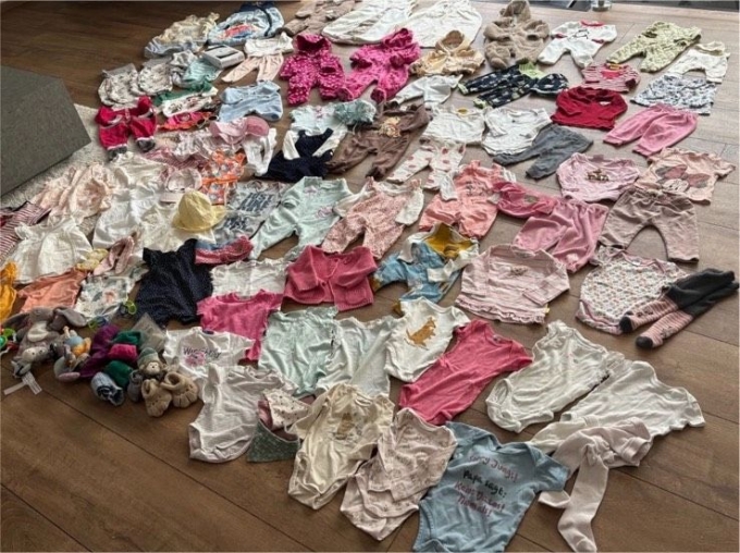 Mehrere Schlafsäcke sind dabei , wagenanzüge , fleeceanzug / Einteiler , Nicki Jacke , Bodys , Pullover , Hosen , Socken , Strumpfhosen, Schlafanzüge, schwimmsachen, Mützen , Hüte usw. ….. wirklich ein komplettes Paket , mit allen Sachen , die man am Anfang so braucht …
