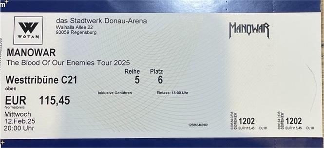 Biete 1 Manowar Konzertkarte am 12.02.2025 in Regensburg an. Kann leider selber nicht hingehen.