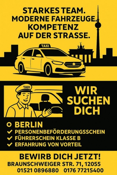 Wir suchen zuverlässige und freundliche Taxifahrer für den Einsatz in Berlin – bevorzugt in der Spätschicht.