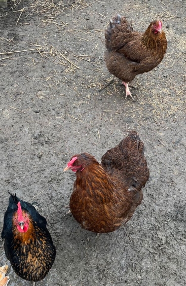 Die Schwarze ist knapp vier Jahre alt, die beiden Wyandotten sind im August 2022 geschlüpft, also ca 1,5 Jahre alt.