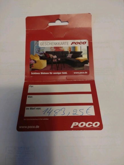 Ich biete einen POCO Gutschein im Wert von 1483,25€ (in Woten : Eintausendvierhundertdreiundachtzig Euro und fünfundzwanzig Cent) für 1300 € (in Worten Eintausenddreihundert Euro an .Nach Stornierung eines bestellten Artikels wurde mir leider mein Geld nicht zurück überwiesen sondern in Form eines Gutschein erstattet ! Der Gutschein ist in allen Filialen des Möbelhauses POCO in Deutschland bis Dezember 2026 einlösbar ! Gern treffe ich mich mit Ihnen vor Ort (Weiterstadt,Viernheim,Mannheim )damit Sie sich überzeugen können das der Gutschein gültig ist und auch der Betrag auf der Gutscheinkarte ist ! Nur gegen Bargeld oder PayPal Überweisung ! Ihr spart 183,25 €!