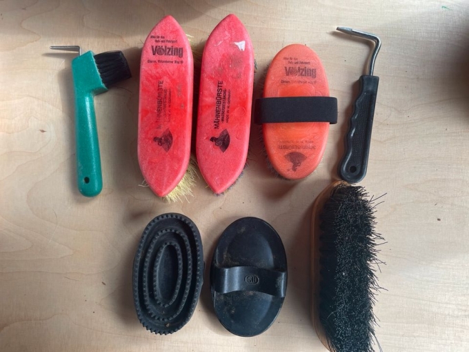 Ich biete hier verschiedene Bürsten und Utensilien zum Striegeln und Pflegen von Fell, Mähne und Hufen.