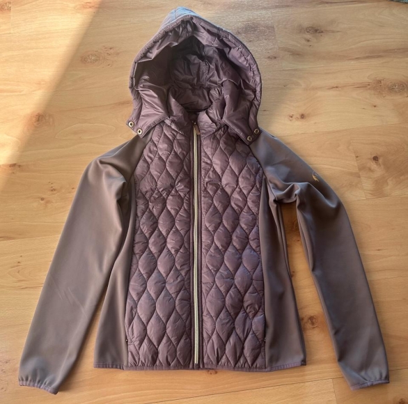 dünne Reitjacke von Cheval de Luxe, Gr M, Farbe lila/pflaume, neu und ungetragen, Kapuze abnehmbar, 2 seitliche Taschen mit Reißverschluss, leider ist bei einer Tasche innen der Saum ausgefranst, siehe Foto 4&5