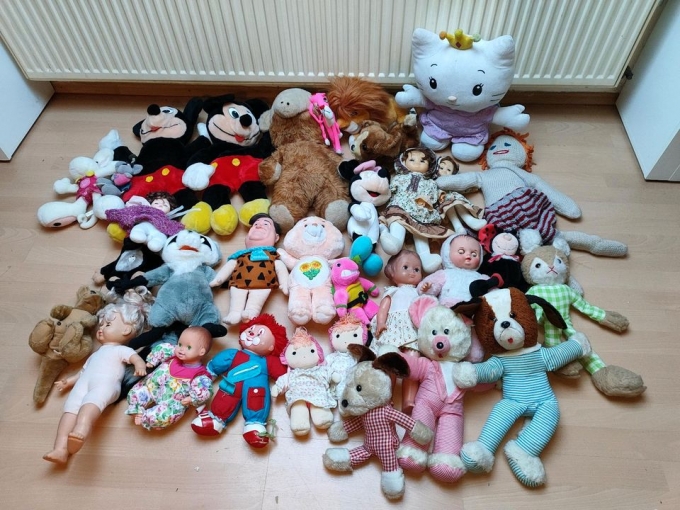 Großes Konvolut an Stofftiere ,Mickey Mouse Minnie Mouse,Alf, hello Kitty,Fred Feuerstein,Puppen, Diddl,Glücks Bär und vieles mehr siehe Fotos, Gebrauchsspuren vorhanden mal mehr mal weniger,müsste alles Mal gereinigt werden staubig schmutzig usw wurde lange gelagert keine Rücknahme privat.