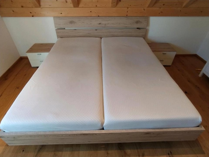 Biete ein Doppelbett für zwei Matratzen 90x200cm inkl Nachtkästchen. gebraucht aber in einwandfreiem Zustand. Eiche Nachbildung