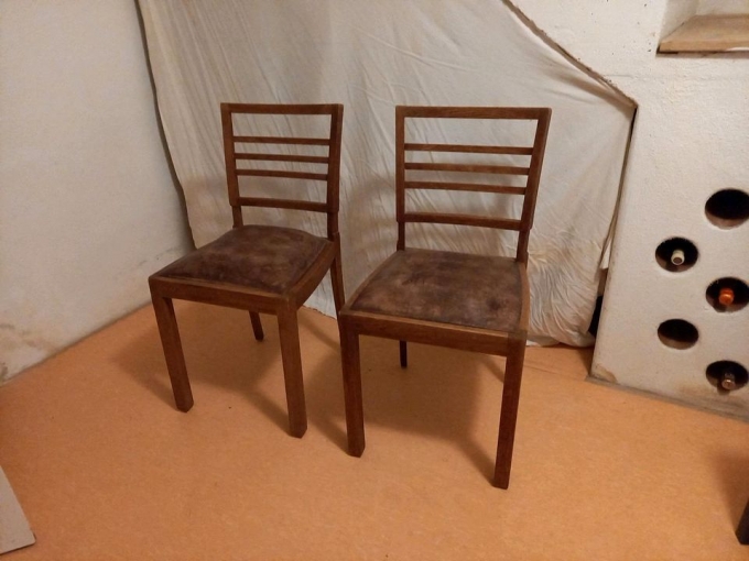 Biete 2 schlichte Eichen Stühle ca. Jahrhundertwende mit original Lederbezug .Die Stühle sind sehr stabil,