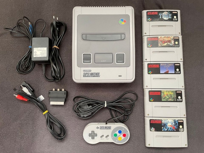 Super Nintendo Konsole mit 1 originalen Controllern von der Marke Nintendo und den Anschlusskabeln ( originales Netzteil von Nintendo plus AV Kabel mit Scartadapter und tollen Rollenspielen .