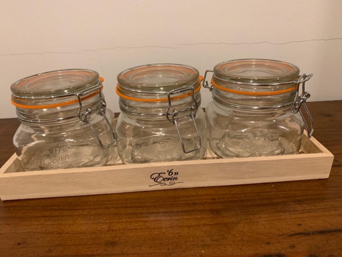 Werden hier nicht genutzt daher nun abzugeben. Neu und ungenutzt. Holztablett mit 3 Glas Bügelgläsern. 35,5x13,5cm.