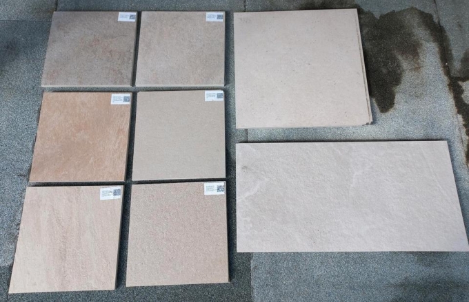 Hier gibt es ein Paket von 9 Stück Muster Feinsteinzeug Terassenplatten. 20mm stark für alle Verlegungsarten.