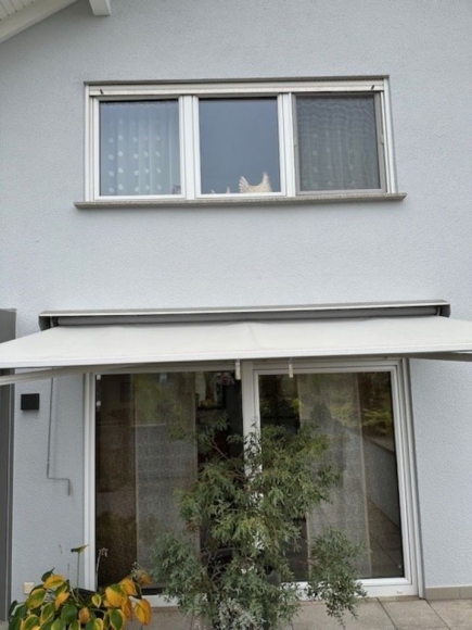 gut erhaltene Terrassenmarkise in grau / silber -Tönen/Farben