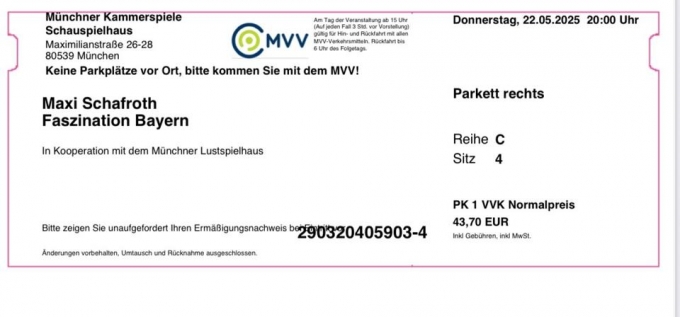 Biete 4 Tickets für Maxi Schafroth am 22.05.2025 um 20:00 im Schauspielhaus in der Maximilianstr. in München, Reihe C, Sitz 1-4