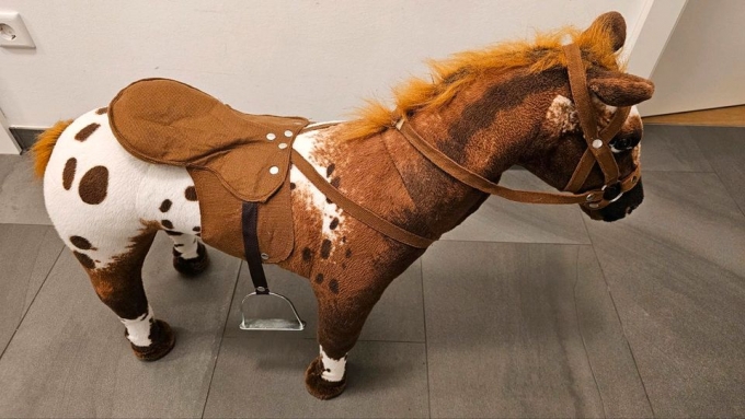 Angeboten wird ein Spielzeugpferd für Kinder im Alter von etwa 2 bis 4 Jahren inkl. Sattel und Steigbügel.