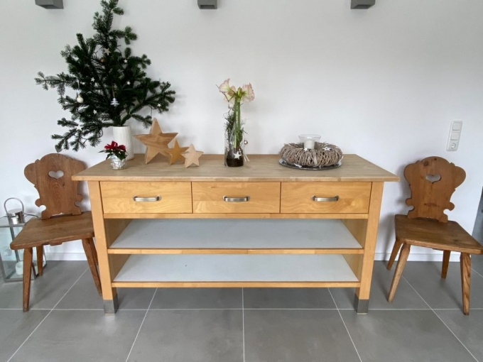 Das Möbelteil kommt von IKEA aus der Serie Värde und wird dort leider schon einige Jahre nicht mehr angeboten. Wir haben damals vor rund 12 Jahren davon schon einmal diese Anrichte neu für 399 € bei Ikea gekauft, die steht seit dem als Arbeitsbank in unserem Hauswirtschaftsraum im Keller, deswegen kenne ich das Teil und "liebe" es.