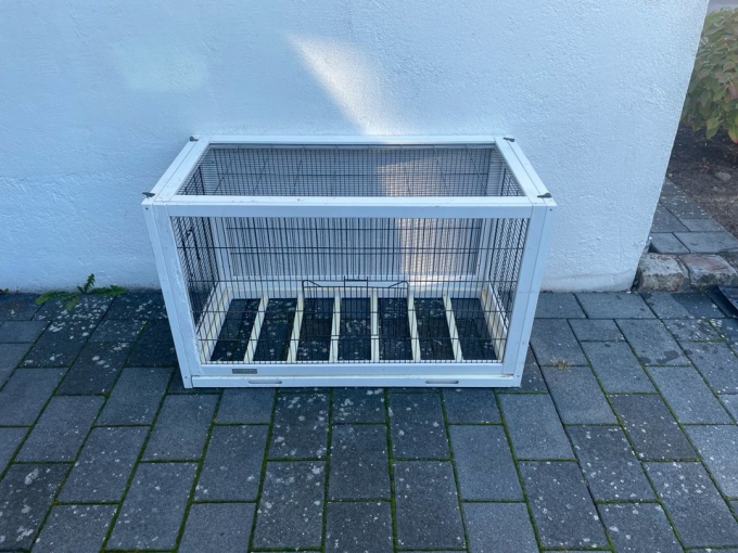Zum Verkauf steht ein Vogelkäfig aus weißem Holz Er ist 1 m breit, 50 cm tief und 60 cm hoch.