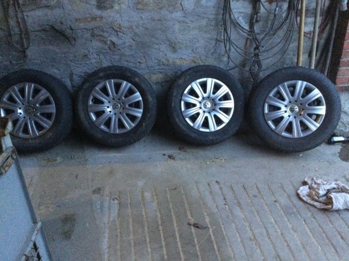4 Reifen auf Stahlfelgen mit Radzierkappen.
