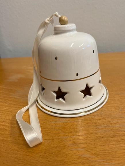 Schöne alte Weihnachtsglocke, Porzellan mit Holzkugel am Satinband, sehr schöner Klang.
