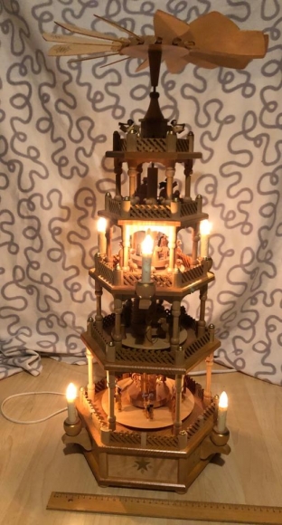 Ca. 25-30 Jahre alte Weihnachtspyramide mit 5 Motivebenen sowie Sockel und "Windrad". 6 elektrische Kerzen. Motor, der die Motive langsam dreht.
