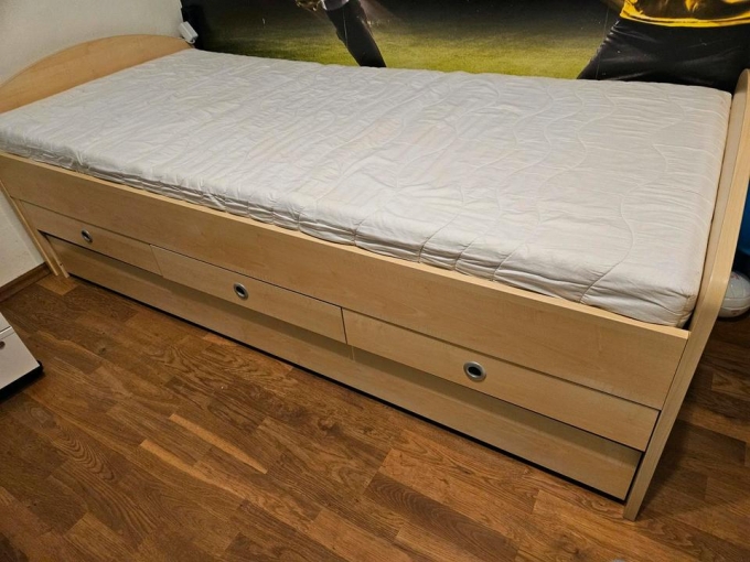 Wir verkaufen hier ein gut erhaltenes Jugend- bzw. Kinderbett (90x200) der Firma Welle mit Lattenrost und Matratze. Das Bett verfügt über mehrere Schubkästen und einen größeren Schubkasten (unten), der Platz für eine zweite Matratze (max. Länge 190 cm) bietet.