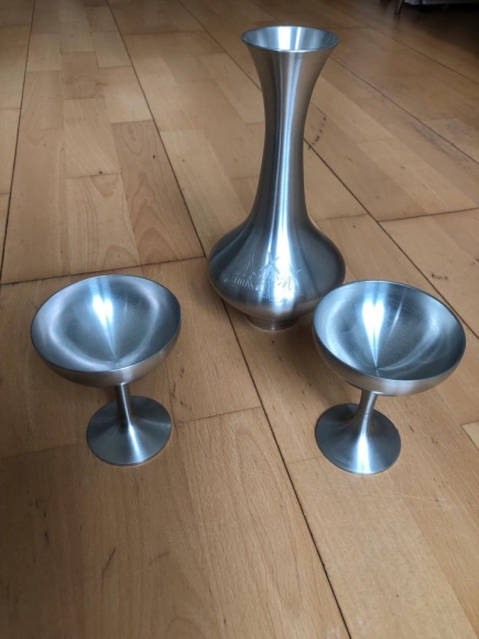 Verkaufe zwei schöne Zinnbecher, Höhe 11 cm und eine Zinnvase, Höhe 23 cm mit Gravierungen. Gerne auch separat abzugeben. zusammen circa 1,1 kg